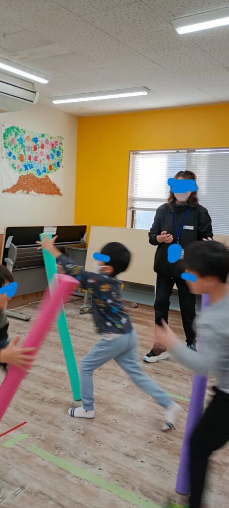 本日のトレーニングは、プールスティックを使ってのトレーニングです。 子供達が輪になり、それぞれ1本ずつ持ち、「1・2・3ハイ」で手を離します。 右隣へ移動しなが…