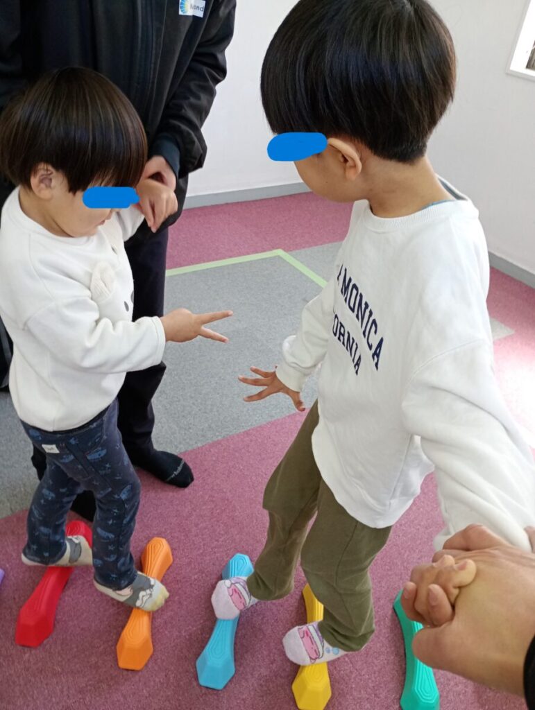 小さいお友だちは、かえるのたいそうと、ラジオ体操第一を踊りました🤸♀️ その後、バランスじゃんけんをしました✊ 2チームに分かれ、平均台やスポンジポールの上を…