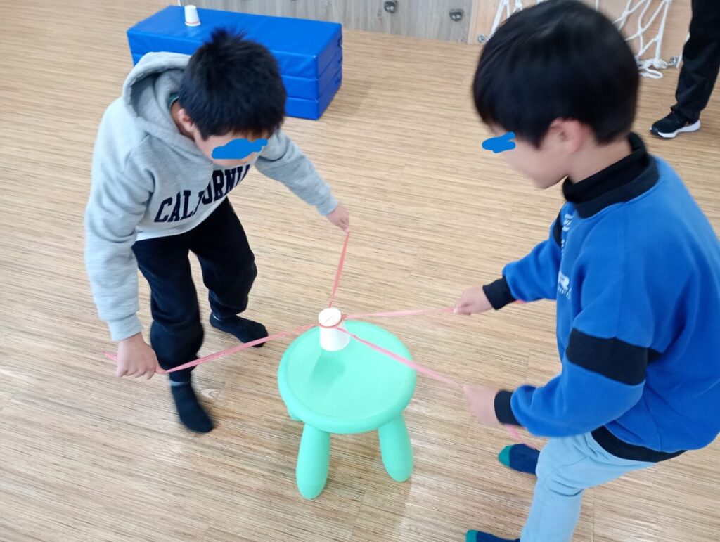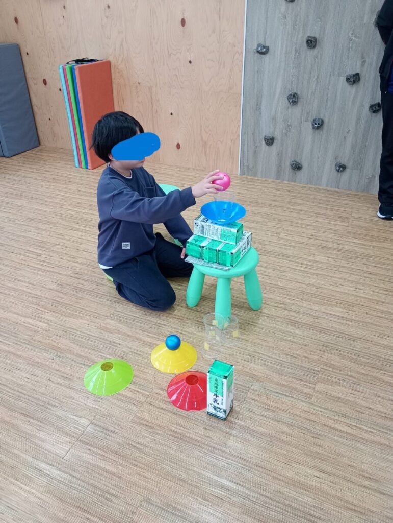 今日は牛乳パック、ボール、カラーコーンなどを上に積み上げ 積み上げたものを見えないお友だちに自分の指示で伝え 同じように出来上がるか・・・というトレーニングでし…