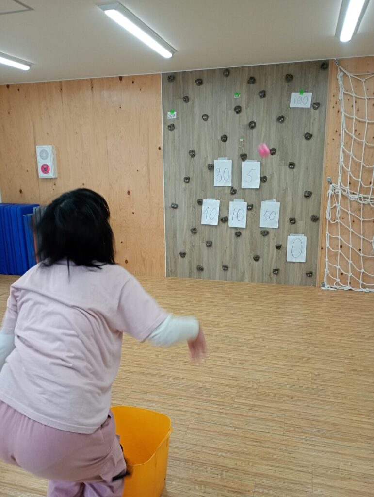 今日は的当てトレーニングです🥎 グルグル自分で5回周り得点が書いてある的に向かってボールを投げます! 高得点は的が小さいうえに自分も回っているので難しいですが …