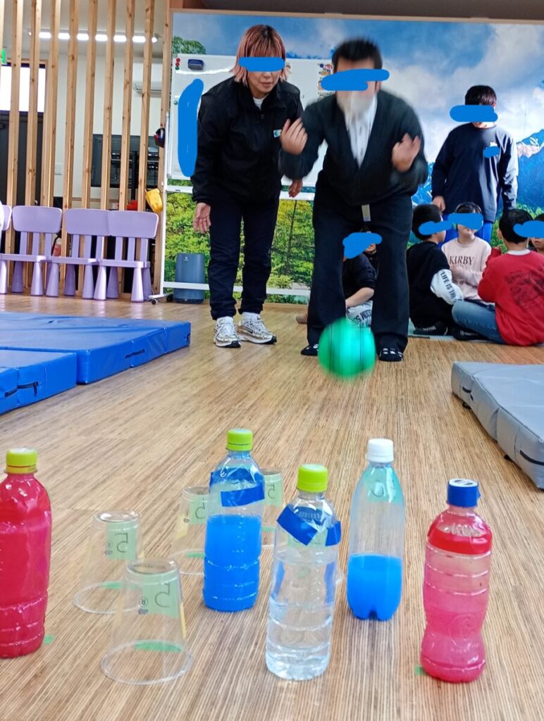 今日は、最近リクエストの多かったボーリング🎳を行いました✨ ピンはペットボトルに水の入った物とプラスチックカップ🥛! 点数🔢が書いてあるので倒したピンの多さだけ…