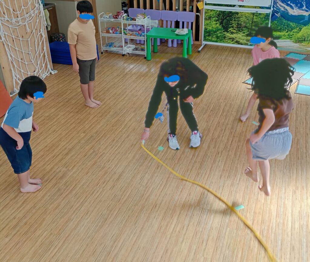 今日は、「プールスティックキャッチ」にチャレンジしました。😉 4人1グループになり、各自プールステックを持ち円になってスタート! 先生の合図「せーの!」の声に…