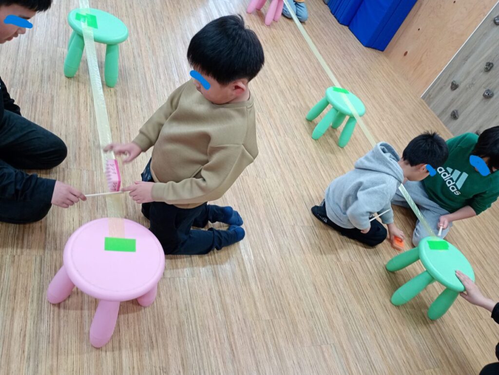 今日はビニールテープを椅子に貼り、橋に見立てて その上を様々な物を二人一ペアになり 協力しながら落ちないように渡りきるトレーニングです!! どれが安定して渡れる…