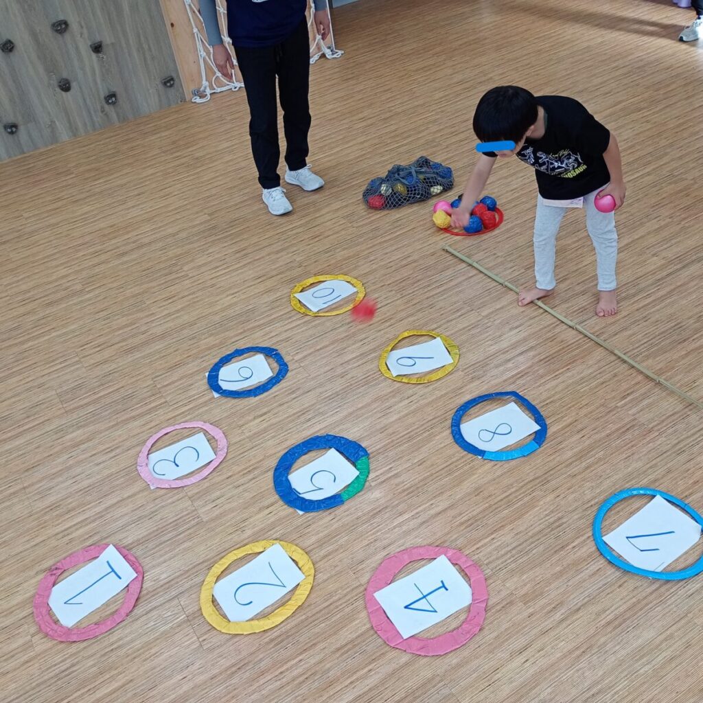 今日は、「フープを使った得点ゲーム」にチャレンジしました。😊 床にランダムにフープを並べて、それぞれの中に点数を書いた紙を貼っておきます。😉 お友だちは、決めら…